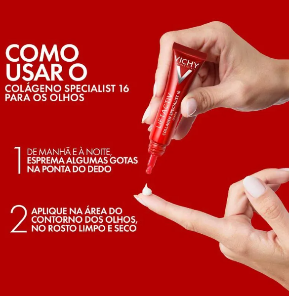 O Creme para Contorno dos Olhos Vichy Liftactiv Colágeno Specialist 16 15 ml age na região delicada ao redor dos olhos estimulando a produção de colágeno e ajudando a suavizar sinais visíveis de envelhecimento. A textura leve e de rápida absorção penetra facilmente sem deixar a pele oleosa ou pegajosa, trazendo conforto e sensação de frescor. Com o uso regular manhã e noite, o produto contribui para melhorar firmeza, elasticidade e textura da pele, reduzindo linhas finas, rugas, olheiras e inchaço — além de ajudar a uniformizar o tom e devolver viço ao olhar.