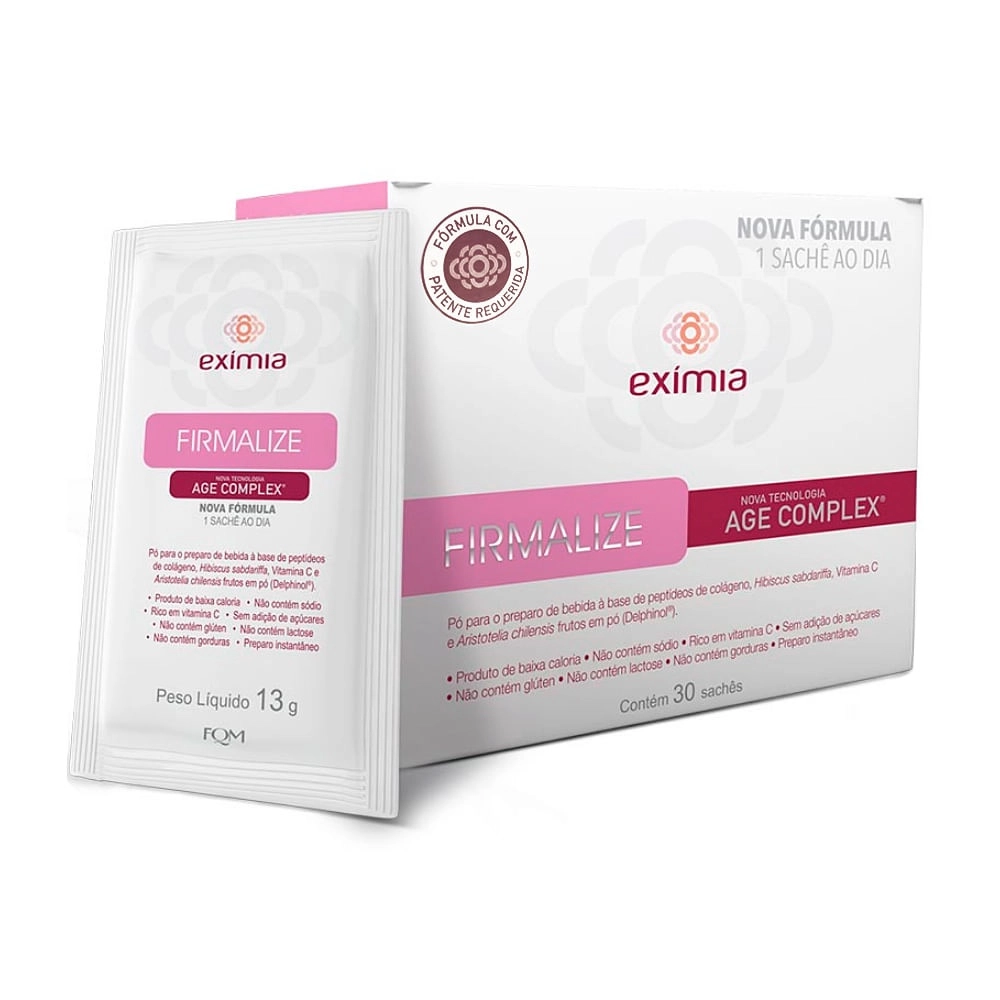 informações do produto Compre Exímia Firmalize Age Complex na Drogaria Araujo! Fórmula com patente requerida à base de peptídeos de colágeno. Acesse nosso site e confira!ficha técnica Código de barras 7898040325374Contraindicação Exclusivo NFabricante Fqm Indicação Informe Ministério Saúde 01 -Informe Ministério Saúde 02 -Informe Ministério Saúde 03 -Informe Ministério Saúde 04 -Informe Ministério Saúde 05 -Informe Ministério Saúde 06 -Informe Ministério Saúde 07 -Informe Ministério Saúde 08 -Informe Ministério Saúde 09 -Informe Ministério Saúde 10 -Possui Venda Permitida SSaiba Mais Exímia firmalize age complex Pó para o preparo de bebida á base de peptídios de Colágeno, Hibisco Sabdariffa, Vitamina C e Aristotelia Chilensis frutos em pó (Delphinol). Produto de baixa caloria. Não contém sódio. Não contém lactose. Rico em vitamina c. Sem adição de açúcares. Não contém gorduras. Preparo instantânea. Sem glúten. Modo de preparo: Adicionar o conteúdo do sachê (13g) em 200 ml de água gelada ou quente. Recomenda-se ingerir 1 sachê ao dia.Fabricante Fqm Product url http://www.araujo.com.br/eximia-firmalize-age-complex/p Sku name Exímia Firmalize Age Complex com 30 Sachês