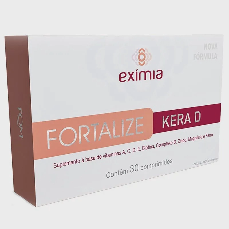 informações do produto O que é o Exímia Fortalize Kera d? O Exímia Fortalize Kera D é um suplemento vitamínico composto por 11 vitaminas, que auxiliam no crescimento, fortalecimento e manutenção das unhas e dos cabelos, deixando-os mais resistentes.Para que serve o Suplemento Vitamínico Exímia Fortalize Kera d? O Suplemento Vitamínico Exímia Fortalize Kera D é indicado para pessoas que buscam unhas e cabelos mais saudáveis, uma vez que ajuda a complementar com vitaminas e minerais necessários para a saúde e que muitas vezes o corpo não absorve naturalmente.Sua fórmula conta com ativos que auxiliam na redução da queda de cabelo e estimulam o crescimento saudável dos fios, deixando os cabelos mais fortes, brilhosos, além de prevenir a calvície, a descamação e outros problemas relacionados à deficiência de nutrientes, incluindo o envelhecimento precoce das células. Ainda, incentiva o crescimento das unhas, garantindo que fiquem fortes, resistentes e com aparência saudável.Ao todo, são 11 vitaminas, incluindo a Biotina e Vitamina d, mais alguns minerais, como Ferro, Zinco e Magnésio, além de um complexo de aminoácidos com 19 constituintes da queratina, incluindo a Cistina. Confira a ação de alguns dos ativos:Biotina: restabelece a força e textura dos cabelos. Zinco: estabiliza o crescimento do fio e fortalece as unhas. Ferro: ingrediente essencial à célula do bulbo capilar. Cistina: possui a capacidade de formar redes que aumentam a rigidez e a resistência da fibra capilar. A sua deficiência promove a queda e torna os cabelos mais frágeis e quebradiços. Magnésio: participa do metabolismo de proteínas, as quais garantem estruturação da pele, unhas e cabelos. Vitamina d: ajuda a melhorar a espessura dos fios e a diminuir a queda de cabelo. Também exerce um papel muito importante na saúde das unhas. Como tomar o Exímia Fortalize Kera D? Ingerir 1 comprimido ao dia, ou conforme recomendação médica.Composição Vitaminas a, c, d, e, Biotina, Complexo B (B1, B2, B3, B5, B6, B9 e B12), Zinco, Magnésio, Ferro e Pool de Aminoácidos.Alérgicos Não contém glúten, nem derivados de peixes e crustáceos.Qual a diferença do Exímia Fortalize e o Fortalize Kera d? O Eximia Fortalize Kera D possui o dobro das concentrações de ferro, zinco e magnésio quando comparado à versão tradicional.Além disso, o Eximia Fortalize Kera D possui outros dois componentes que não constam na versão original: Aminoácidos e Vitamina d.Advertências Este produto não substitui uma alimentação equilibrada e seu consumo deve ser orientado por nutricionista ou médico. Gestantes, lactantes e crianças de até 3 anos somente devem consumir este produto sob orientação de médico ou nutricionista. Não ingerir se você possui hipersensibilidade (alergia) a algum dos componentes da fórmula. Não exceder a recomendação diária. Conservar em local seco e arejado, protegido da luz e da umidade. Manter fora do alcance de crianças. Sempre seguir as instruções de uso. As informações estão sujeitas a alterações. Sempre verifique a embalagem antes de consumir.ficha técnica Código de barras 7898040325466Marca Farmoquimica Fabricante Farmoquimica